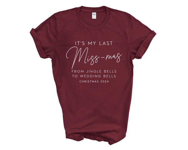 Are you or someone you know walking down the aisle in the next 12 months? Embrace the festive spirit and commemorate this magical moment with our exclusive "Last Miss-mas Christmas 2025" t-shirt!