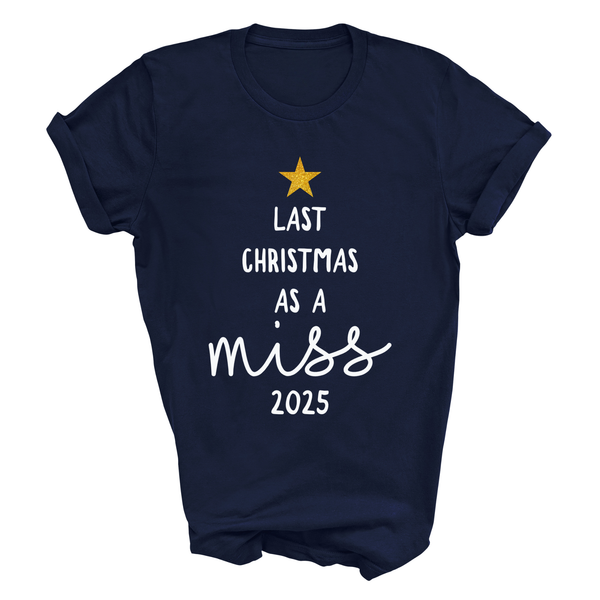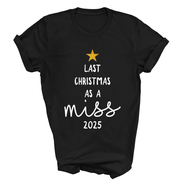 Celebrate your last Christmas as a miss with this stylish t-shirt, designed especially for brides-to-be who want to embrace the festive season in comfort and charm. Featuring a shimmering gold glitter star, this Christmas tee beautifully captures the magic of the holidays while marking your exciting journey toward becoming a wife.